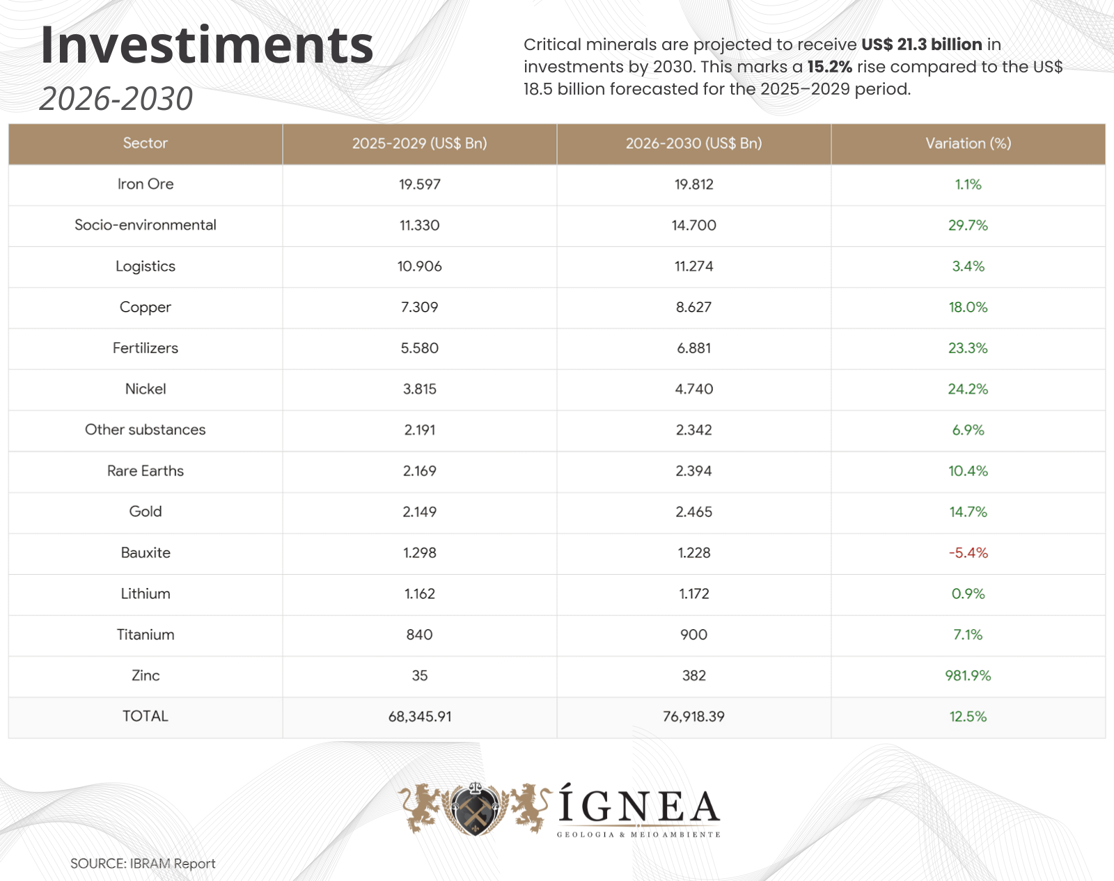 While iron ore remains the largest destination for capital, with a forecast of US$ 19.8 billion (up 1.1%), the report highlights substantial increases in commodities linked to the energy transition and food security.