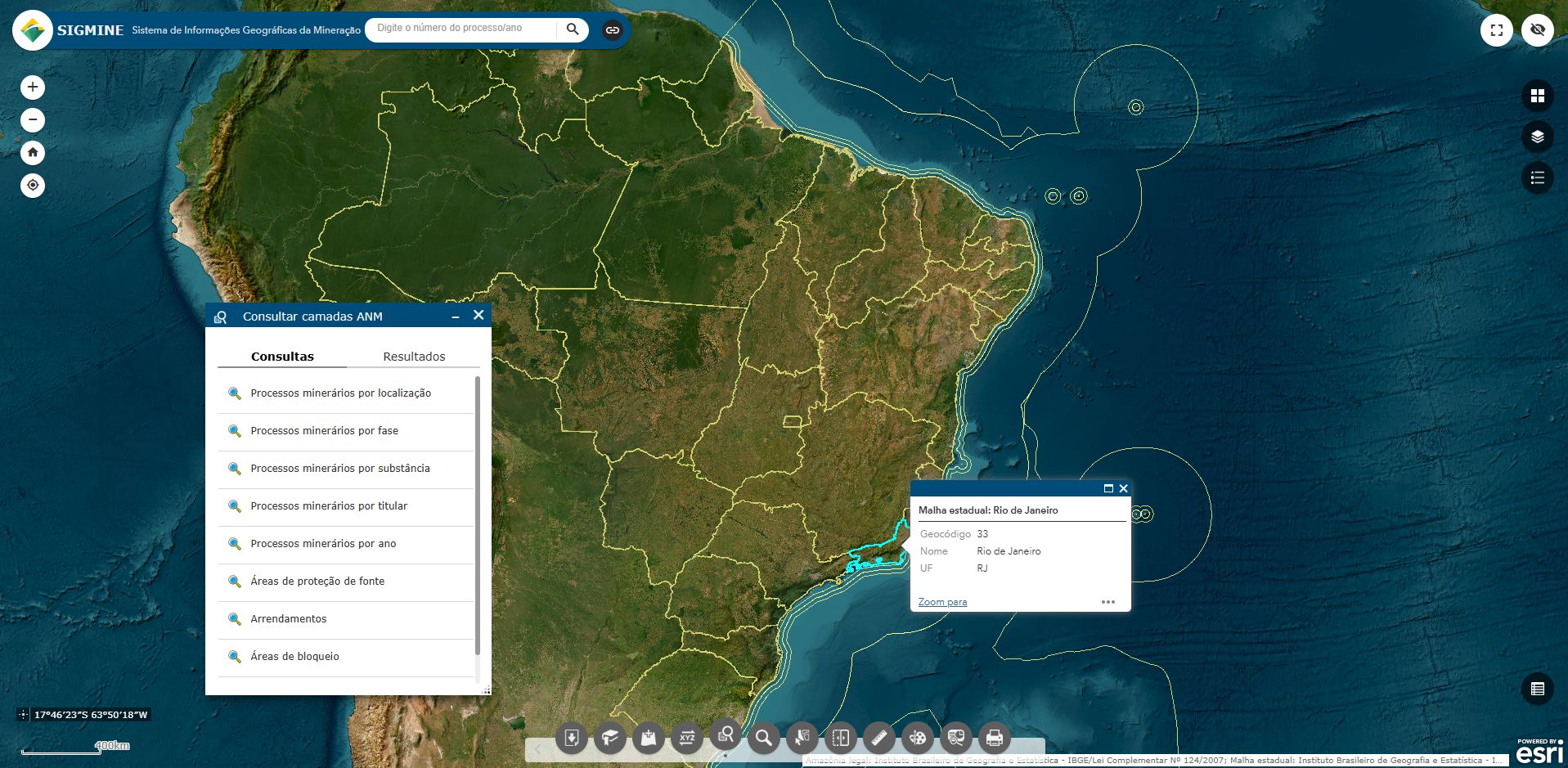 Users can perform searches and measure distances, in addition to generating preliminary reports on areas of interest. The system is composed of a base map over which multiple layers of information are superimposed, enabling the creation of a personalized map with only the information the user needs. It is possible, for example, to simultaneously visualize the location of a mining concession, inland rivers and water bodies, environmental protection areas, and access routes, allowing for a complex analysis of potential opportunities and restrictions.