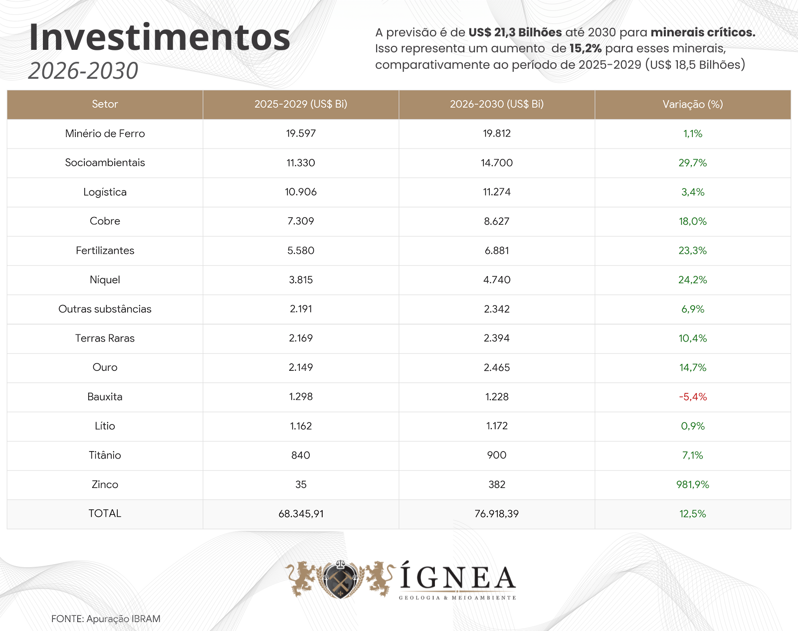 Enquanto o minério de ferro segue como o maior destino de capital, com previsão de US$ 19,8 bilhões (alta de 1,1%), o relatório destaca aumentos substanciais em commodities ligadas à transição energética e à segurança alimentar.