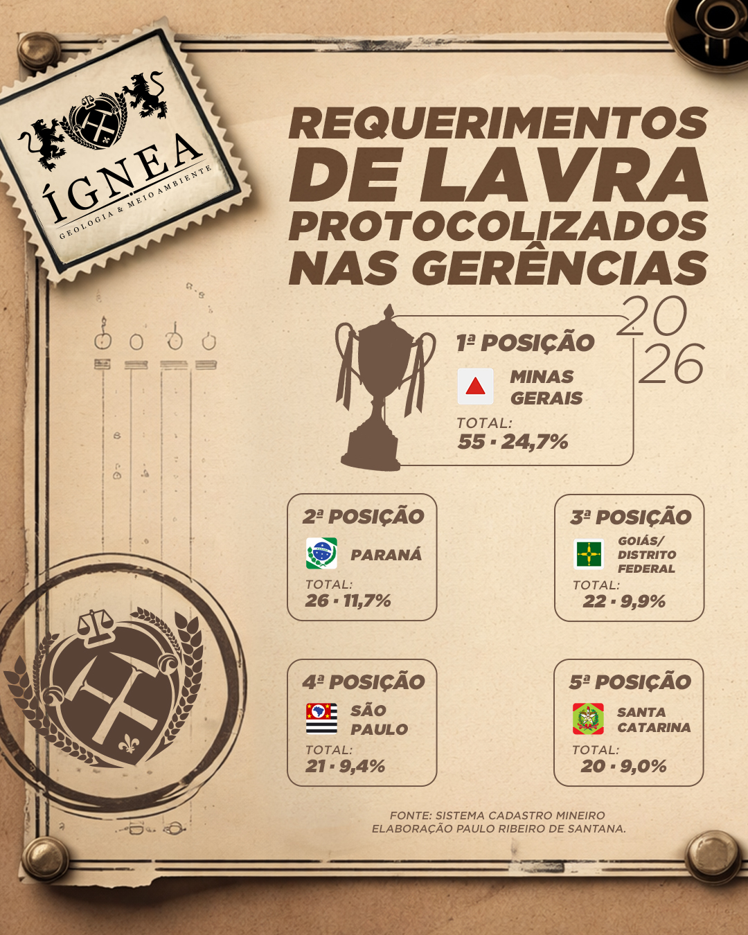 Esta análise técnica examina os dados consolidados dos Requerimentos de Lavra protocolizados nas Gerências Regionais da Agência Nacional de Mineração (ANM) durante o primeiro trimestre de 2026 (janeiro a março). Os dados foram extraídos do Sistema Cadastro Mineiro e refletem o volume de projetos que ultrapassaram a fase de pesquisa e ingressaram na etapa de viabilidade econômica.