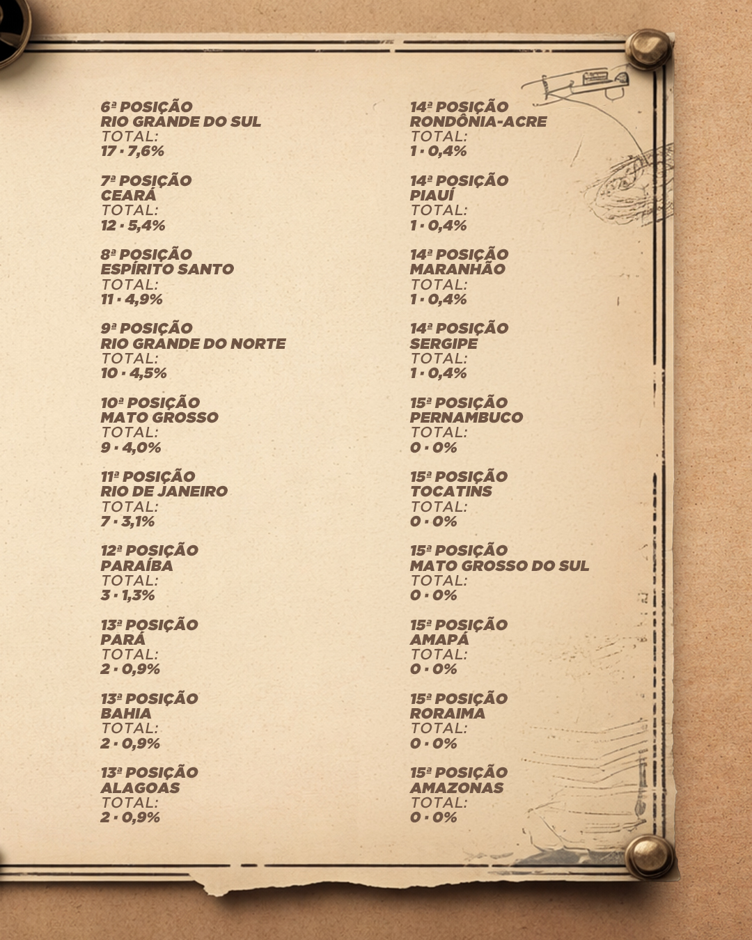 Um dos dados mais relevantes deste ciclo é a consolidação do Paraná (2º lugar – 11,7%), seguido de perto por São Paulo (4º lugar – 9,4%) e Santa Catarina (5º lugar – 9,0%).